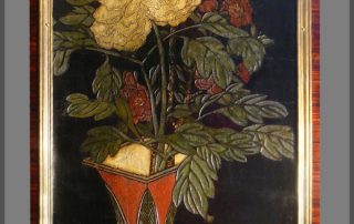 Les panneaux latéraux, légèrement évasés et à ressaut postérieur, sont également plaqués de panneaux de laque de Coromandel polychrome dans des entourages de bois de violette et bois de rose en frisage dans un encadrement de baguettes de bronze mouluré doré. Ils présentent une composition d’un large bouquet de fleurs entouré de divers objets usuels et archaïques.