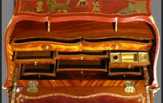 Un exceptionnel secrétaire en pente en vernis européen au décor or sur fond vermillon. De petite taille, galbé toutes faces, il présente en façade, sur les parties latérales, sur le dessus et au dos, un décor de cartouches sinueux représentant des paysages animés d’enfants acrobates ou déguisés, de leurs maîtres, pagodes, papillons, volatile, fleurs et feuillages en or et polychromie sur un fond vermillon.