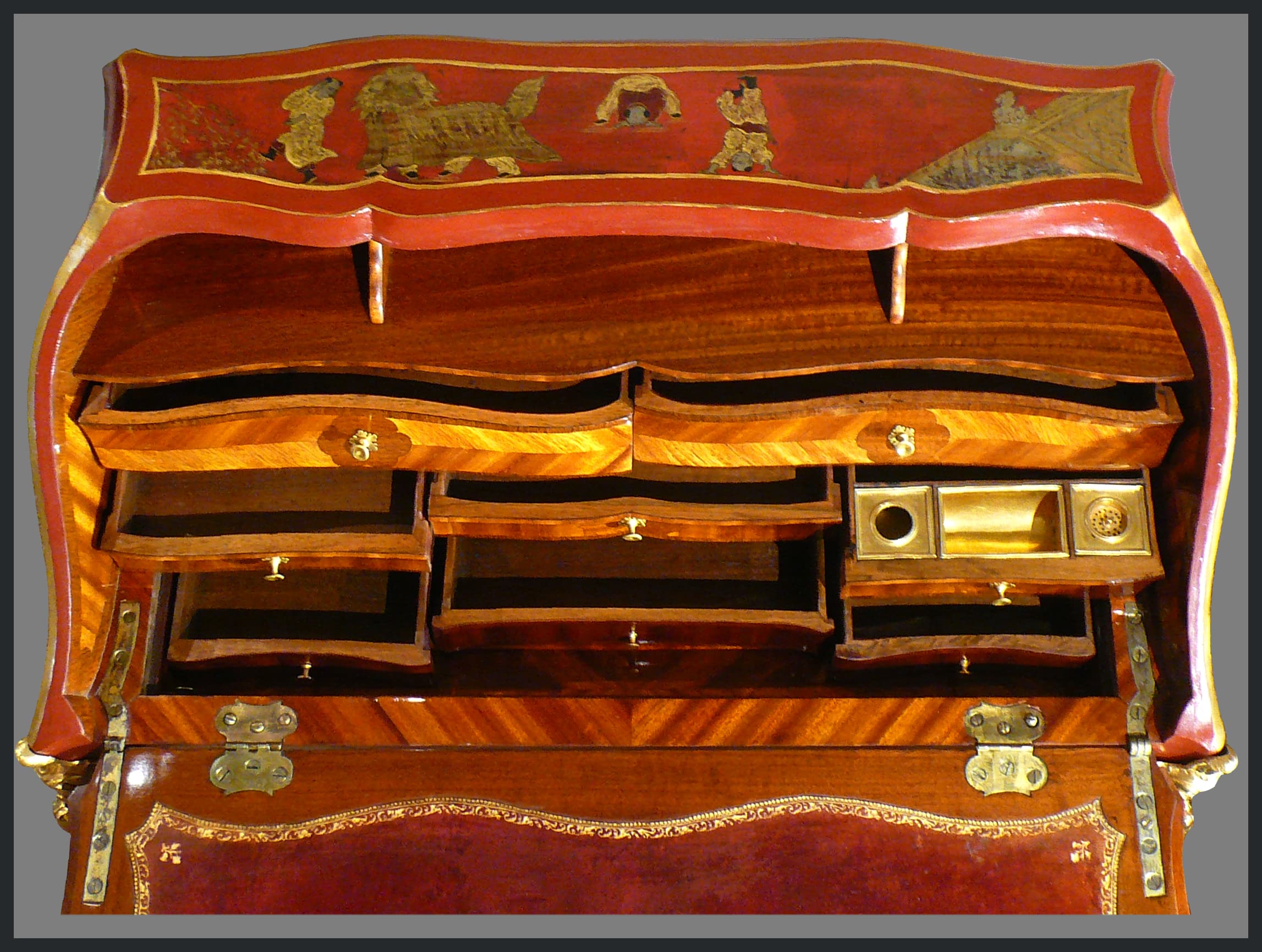 L’abattant est de forme sinueuse. Ouvert, il est soutenu par deux tirettes en acier et deux charnières en laiton. Il démasque un intérieur composé de cinq tiroirs galbés sur deux rangs surmontés par le serre papier. Ils sont marquetés en frisage de bois de satiné en chevron ou en vertical et centrés d’un motif polylobé. Le corps est composé d’une tablette coulissante à secret plaquée en frisage de satiné. Cette tablette est déverrouillée grâce à deux petits boutons poussoirs assimilées aux charnières de l’abattant, et découvre une cave, et six layettes marquetées. Le plateau écritoire est gainé d’un ancien cuir de couleur havane doré aux petits fers, aux contours chantournés.