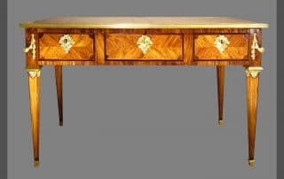 Il ouvre par trois tiroirs en ceinture en façade de travail et en simule trois autres sur la face visiteur opposée. Sur les quatre côtés, marqueterie en ailes de papillons de bois de rose dans un filet de bois clair et encadrement en bois de violette. Il repose sur des pieds marquetés en gaine de section carrée. Ils sont garnis d’exceptionnels bronzes dorés finement ciselés aux angles à motifs de guirlandes de lauriers. Le plateau marqueté de bois de rose dans un encadrement de bois de violette est gainé d’un maroquin havane à vignettes dorées qui est d’origine. Il est cerné d’une lingotière en bronze doré.