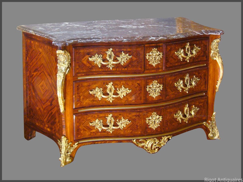 La disposition marquetée de la façade est divisée par les six compartiments des poignées de tirage séparés par les cartouches des entrées de serrures. Les côtés fortement galbés à décor losangé.