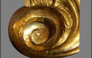 Un feuillage d’acanthe du sabot à enroulement rentrant se détache et s’incline en rejoignant la dernière cannelure rectiligne centrée par l’important cul de lampe qui est très aéré.