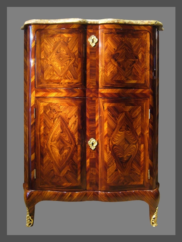 Les parties latérales à panneau à glace. Le compartiment supérieur présente le décor d’un bel acajou de fil blond, puis en contraste, un magnifique acajou ronceux anime le compartiment principal.