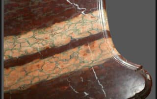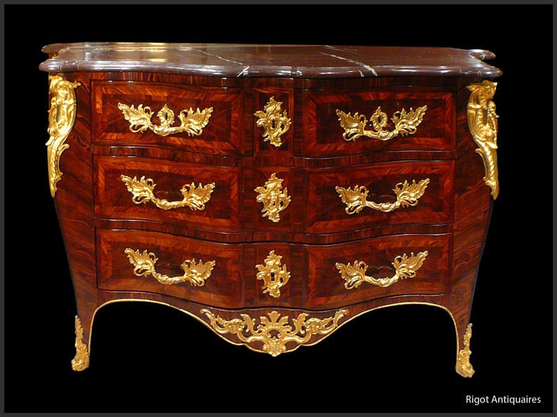 Une très rare et importante et remarquable commode arbalète en frisage de bois violet. La façade a très légère arbalète ouvre par quatre tiroirs rentrants dont deux sous le marbre, au bas deux tiroirs de long superposés aux traverses apparentes au très beau décor losangé de quartefeuille dans une plate-bande en fil vertical et entourage de fil contrarié puis encadrement en fil horizontal. Les montants antérieurs échancrés en partie sommitale sont galbés, pincés, à fort renflement et à l’arête abattue. Les montants postérieurs, très saillants, également échancrés en partie sommitale, sont galbés, pincés, à fort renflement et à l’arête abattue mais surtout avec un particularisme : en retrait décalé du fond du bâti. Les parties latérales sinueuses à dessin en frisage losangé. Les traverses agréablement sinueuses. Remarquables bronzes ciselés et dorés tels : entrées de serrures feuillagées, mains de tirage fixes ajourées, feuillages et volutes, cul de lampe à coquille, feuillages et volutes, magnifiques chutes aux quatre montants au décor de coquilles, volutes et contre-volutes, feuillages, les sabots engainants aux enroulements et feuillages, joncs moulurés soulignant les traverses. Certains bronzes au ‘C’ couronné. Les palastres de serrures en laiton doré et construites spécialement pour épouser la forme de l’arbalète. Elle est coiffée de son marbre Campan rubané mouluré à bec de corbin.