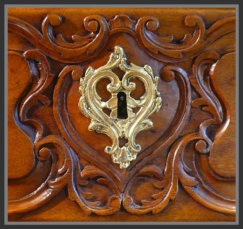 4 – Cet ensemble de la façade sculptée des tiroirs apporte un rythme et une harmonie visuelle entre lignes droites et lignes très contournées. Sculptures denses et aplat des réserves centrés par le décor principal du cartouche.