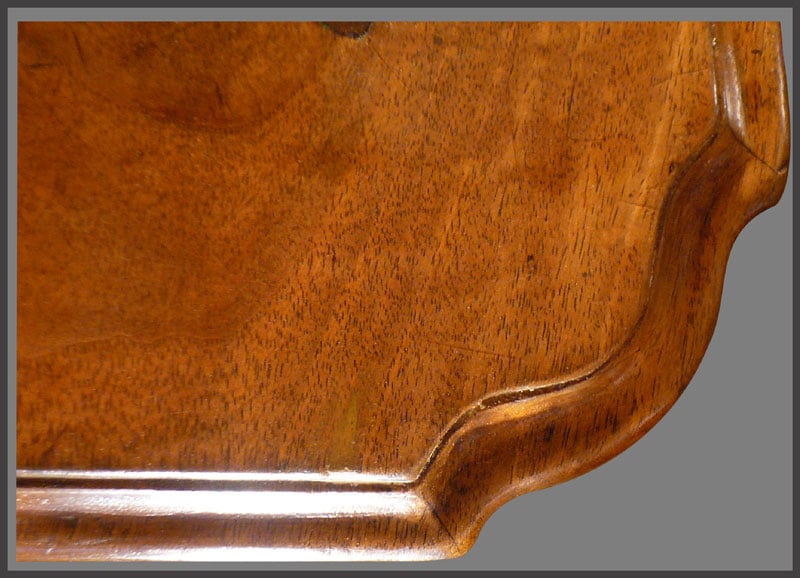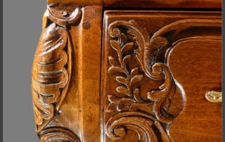 Notre commode en bois de noyer blond est galbée en plan et en élévation. Elle est de forme tombeau ouvrant à trois tiroirs de long. A leurs extrémités, en réserve, très belle sculpture de rameaux en bas-relief et motifs en « C » (a) qui s’interférent avec la forte mouluration cernant le pourtour de la façade du tiroir.