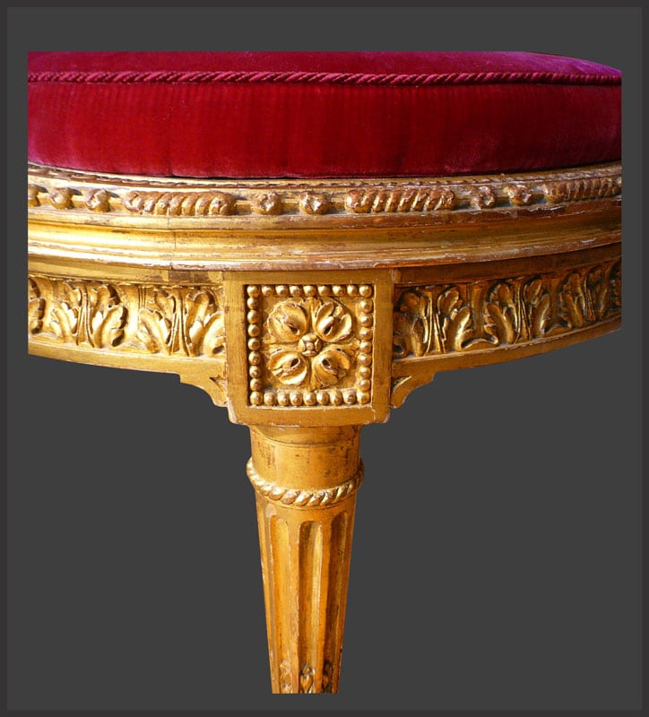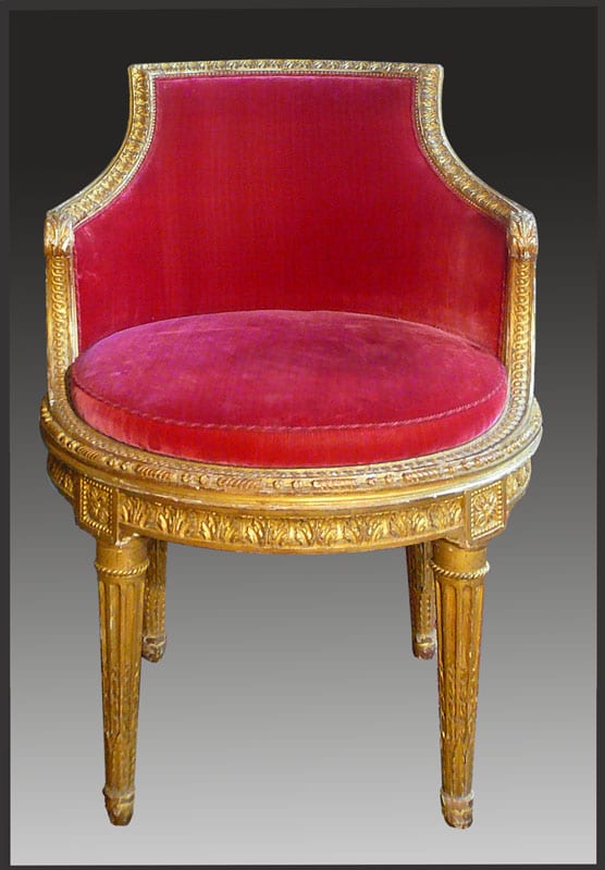 Un rare fauteuil de bureau en bois sculpté, mouluré et doré estampillé Georges JACOB. Il présente un dossier incurvé à la traverse haute rectiligne, aux pourtours sculptés d’une frise de feuilles d’acanthes. Les accotoirs légèrement évasés se terminent par un enroulement et une sculpture d’acanthe. Les supports d’accotoirs concaves sont embrevés dans le prolongement de la ceinture. Son assise circulaire est tournante. Elle présente une frise d’entrelacs, un rang de cordelettes alternées de petits boutons sur un large gorge moulurée. Les dés de raccordements quadrangulaires sont sculptés en leur centre d’une fleur en quartefeuille et entourage de perlettes. Il repose sur quatre pieds fuselés sommés d’une bague en cordelette. Ils sont cannelés et rudentés, avec une remontée de feuilles d’eau et d’asperges.