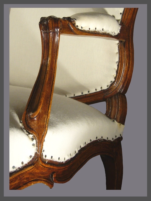 Le dossier cintré à profondes et fines moulurations est sommé d’un décor de deux roses épanouies et d’un feuillage sculpté d’un dessin réaliste délicat et très finement travaillé. Nous trouvons un décor similaire accusant les épaulements.