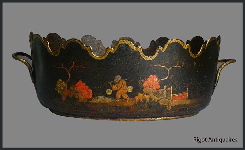 Une paire de verrières de forme ovale en tôle à décor « aux Chinois » en vernis Martin, rouge et or sur fond noir. Chaque face présente un décor déclinant un paysage lacustre animé dont pagodes, villageois, rochers percés, arbres et fleurs. Fine bordure crénelée soulignée par un filet doré. Elles sont chacune munies de deux anses de préhension rivetées sur leurs parties latérales.