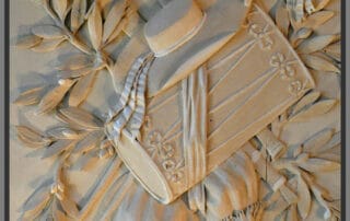Il est paré en partie supérieure d’un encadrement formé d’une belle et puissante moulure chantournée à double accolade au décor centré d’une remarquable sculpture en haut-relief aux motifs agrestes et d’un trophée de musique magnifiant toute l’âme provençale. En effet, les objets et accessoires de la vie quotidienne, les instruments à vent ou à percussion provençaux sont mis à l’honneur. Nous retrouvons alors, le tambourin et le galoubet (petite flûte à trois trous) du tambourinaire ainsi que la cornemuse utilisée pour le folklore musical, le barigoule (chapeau féminin) accessoire de mode indispensable pour se protéger du soleil ardent, mais également la pelle à grains et les rameaux d’olivier, symboles de prospérité. L’ensemble est délicatement retenu par un nœud rubané et terminé par deux pompons.